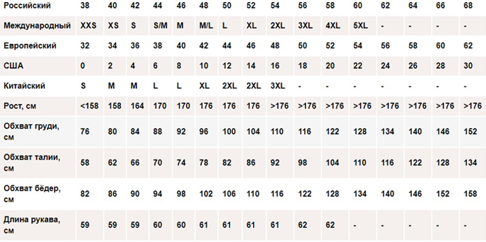 | Российский размер | Международный размер | Европейский размер | Обхват груди (см) | Обхват талии (см) | Обхват бедер (см) |