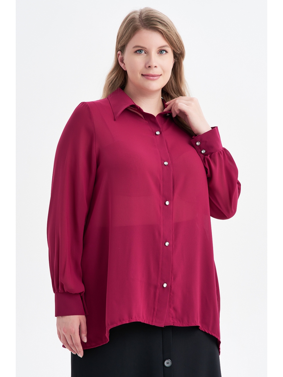 Женская блузка больших размеров выполнена из струящегося шифона, отложной воротник, застёгивается на пуговицы, с длинным рукавом на манжете.