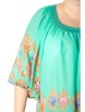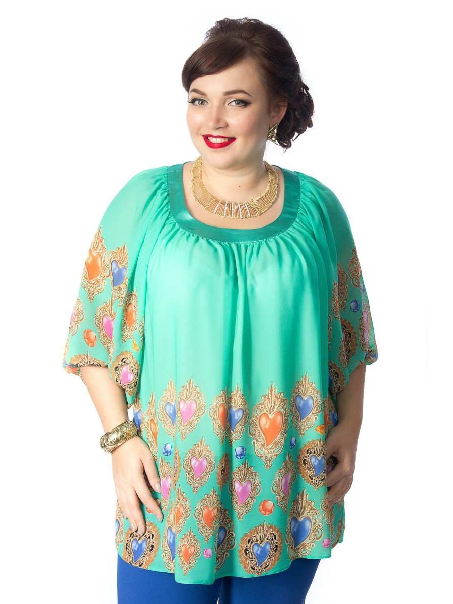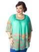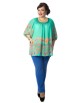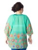 Стильная туника свободного силуэта из яркого полотна шифон зелено-бежевого цвета с купонным вырезом. Фигурный вырез изделия обработан внешней обтачкой. Изделие дополнено сборками. По низу рукавов «реглан» - окантовка.