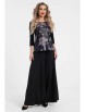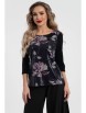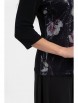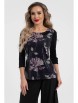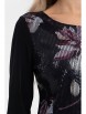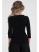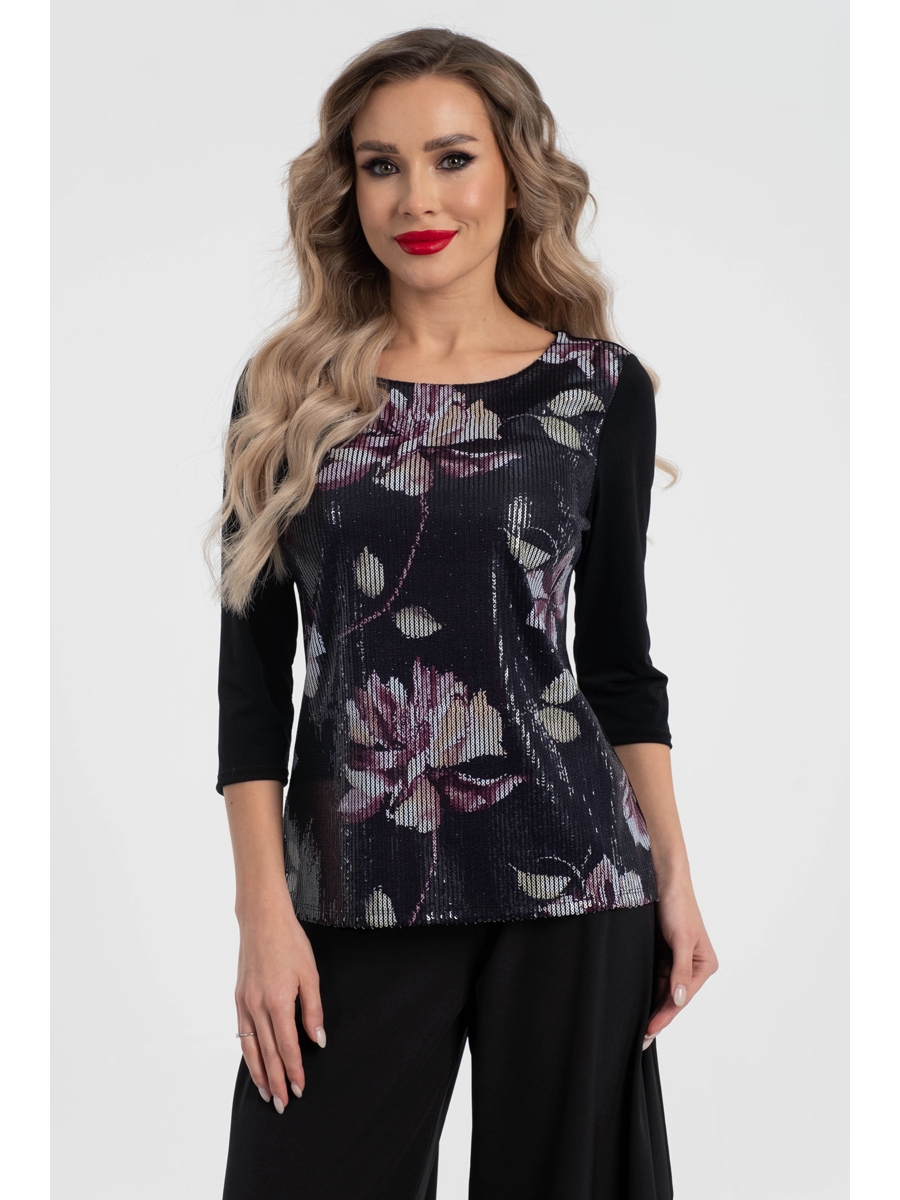 Эффектный джемпер полуприлегающего силуэта из трикотажного полотна черно-фиолетового цвета. Перед изделия выполнен из трикотажа с мелкими пайетками. Круглый вырез изделия обработан внутренней обтачкой. Джемпер с втачными рукавами. Длина изделия от плечевого шва по спинке до низа изделия — 58 см.