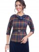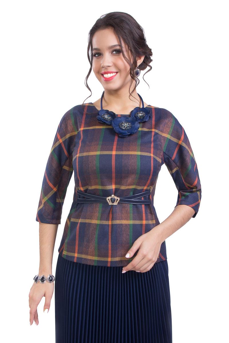 Женственная блуза прилегающего силуэта из текстильного полотна синего цвета. Круглый вырез изделия обработан внутренней обтачкой. Блуза с цельнокроеными рукавами. Перед изделия дополнен декоративным элементом. По спинке блузы застежка на молнию.