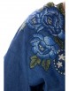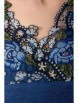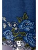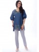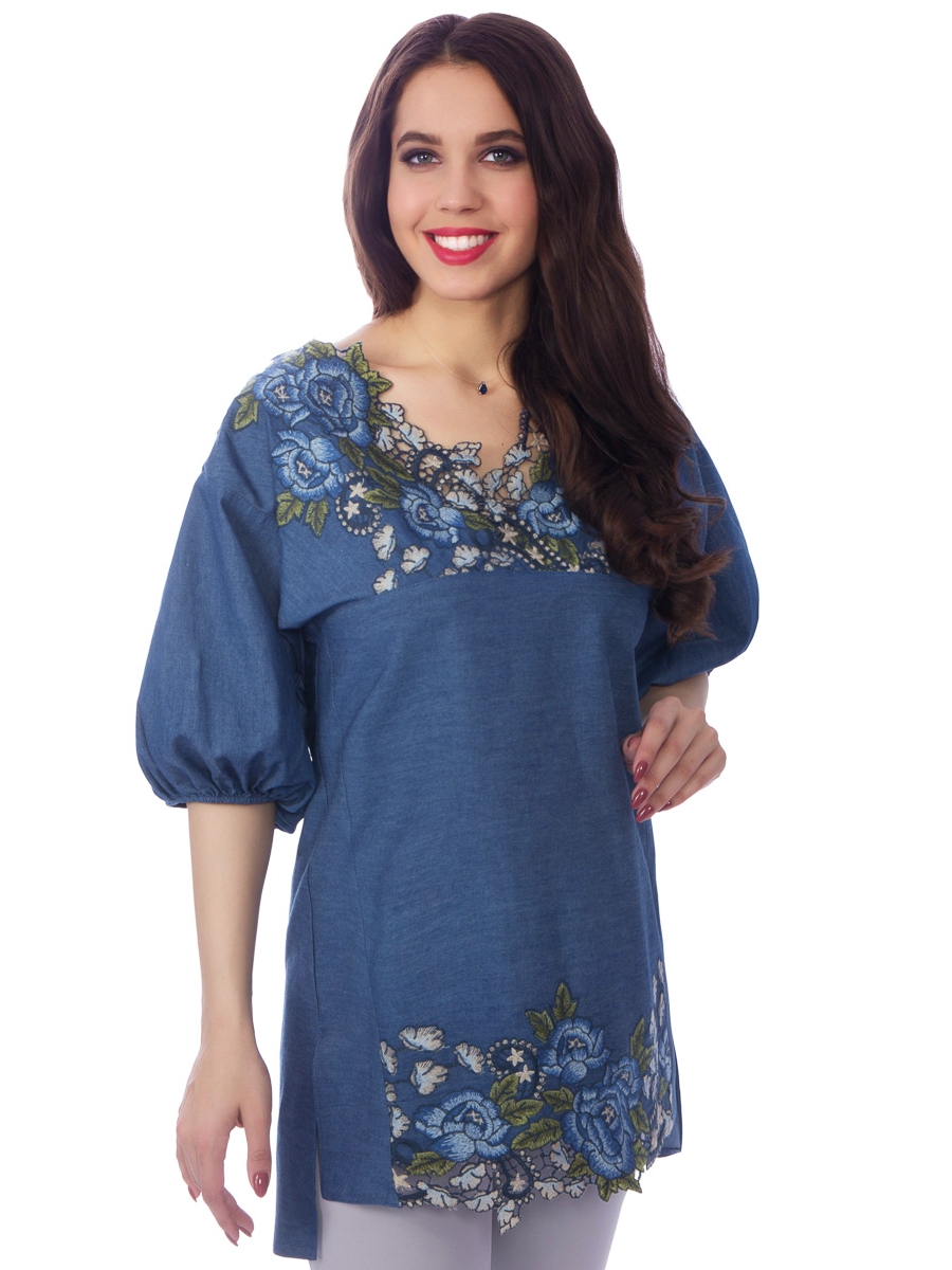 Очаровательная блуза прямого силуэта из текстильного полотна синего цвета. Кокетка изделия и низ блузы по переду украшены вышитым кружевным рисунком. Блуза со спущенной линией проймы. Низ втачных рукавов дополнен сборками на резинке.