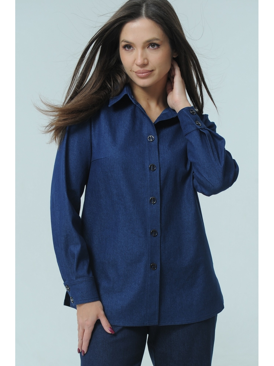Воротник отложной на стойке. Полочка цельная с нагрудными вытачками. Застежка центральная на петли и пуговицы. Спинка с отрезной кокеткой, в боковых швах разрезы. Рукав двухшовный втачной с односторонними складками и притачной манжетой по низу.