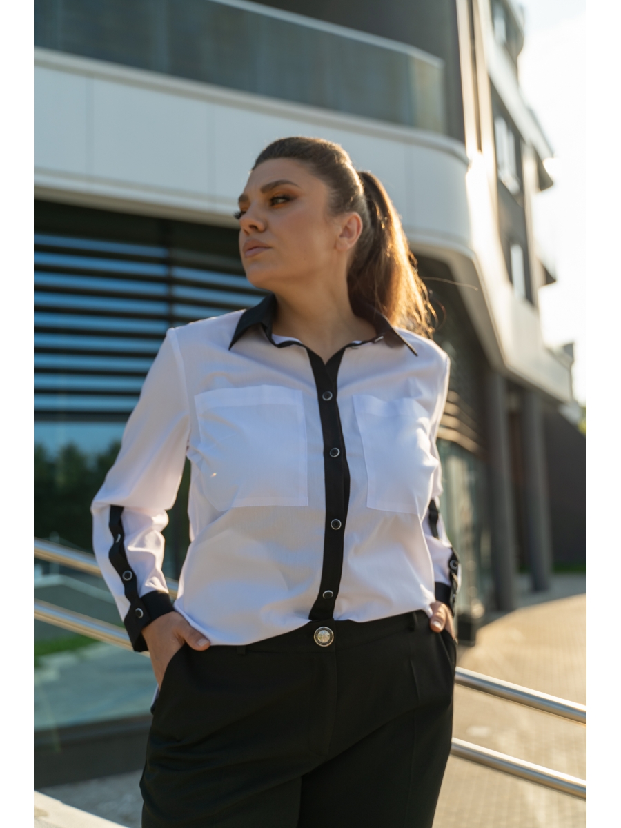 Блузка женская комбинированная, из хлопковой ткани, прямого покроя, воротник с отрезной стойкой, на полочке настрочные фигурные нагрудные карманы. блузка с центральной бортовой застёжкой на петли пуговицы, с втачными рукавами с притачными манжетами с оригинальными застёжками-планками застёгивающиеся на петлю и пуговицу, спинка с отрезной кокеткой со складками , низ блузки с разрезами.