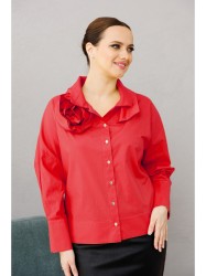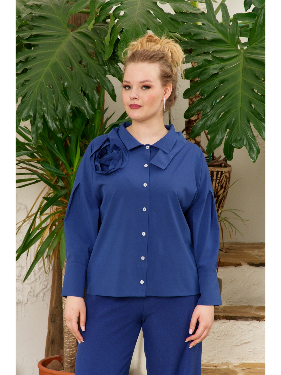 Блузка женская с акцентным декором полуприлегающего силуэта. Рукав "летучая мышь" с подрезом по линии проймы и односторонними складками и манжетой. Застежка - планка на петли и пуговицы. Воротник стояче-отложной. В качестве декора - дополнительный воротник, плавно переходящий в цветок. Благодаря своему крою станет базовой вещью в вашем гардеробе. Легко сочетается с любыми брюками, юбками, платьями и джинсами.