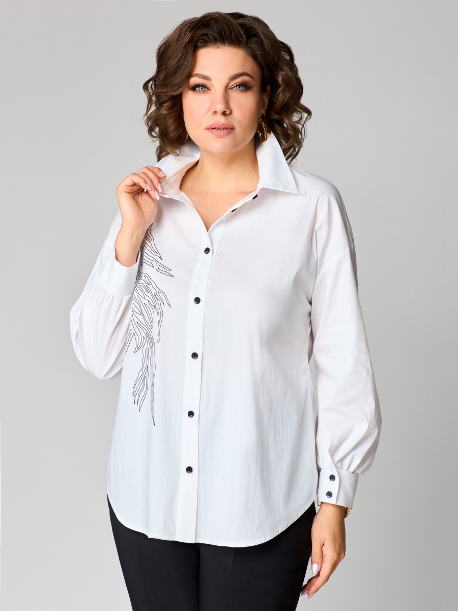 Блузка прямого силуэта выполнена из хлопкового полотна, со спущенной линией плеча и печатью по правой части. Рукав со сборкой по низу, манжета с застёжкой на петлю и две пуговицы. Воротник отложной на стойке. Спинка с отлетной кокеткой.