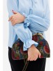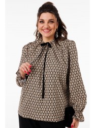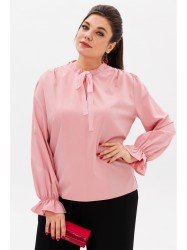 Длинные втачные рукава свободного кроя украшены сборкой по низу и декоративными завязками, добавляя нотку игривости и оригинальности. Воротник-стойка, отделанный бархатной тесьмой, придает блузе особый шарм и утонченность.