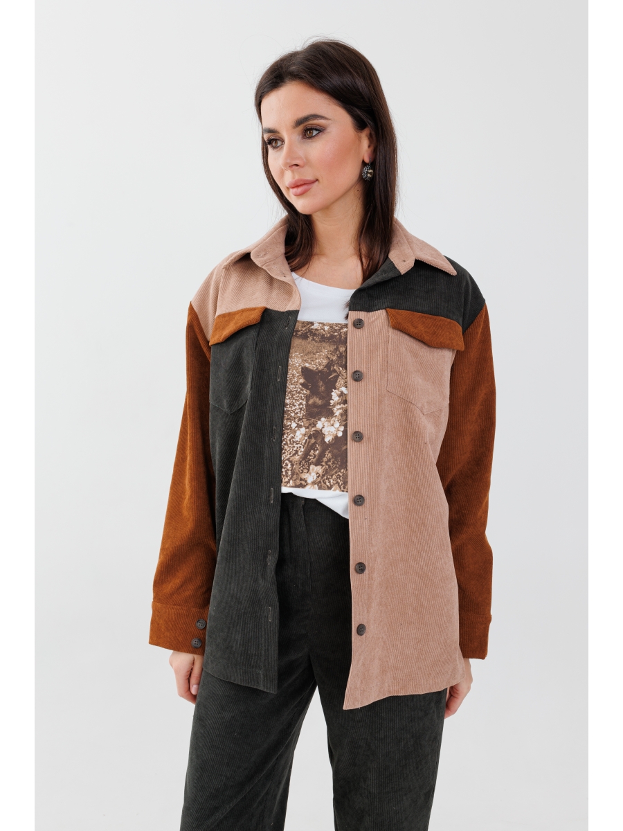 Рубашка женская, прямого силуэта, в стиле пэчворк, длина до середины бедра. Спущенное плечо, рукав длинный на манжете. Горловина обработана воротником со стойкой. По переду кокетки, с нагрудными накладными карманами с клапаном, по центру застежка на петли пуговицы. По спинке кокетка декорированная бахромой. Стильная, актуальная и супер комфортная обновка только для вашего образа.