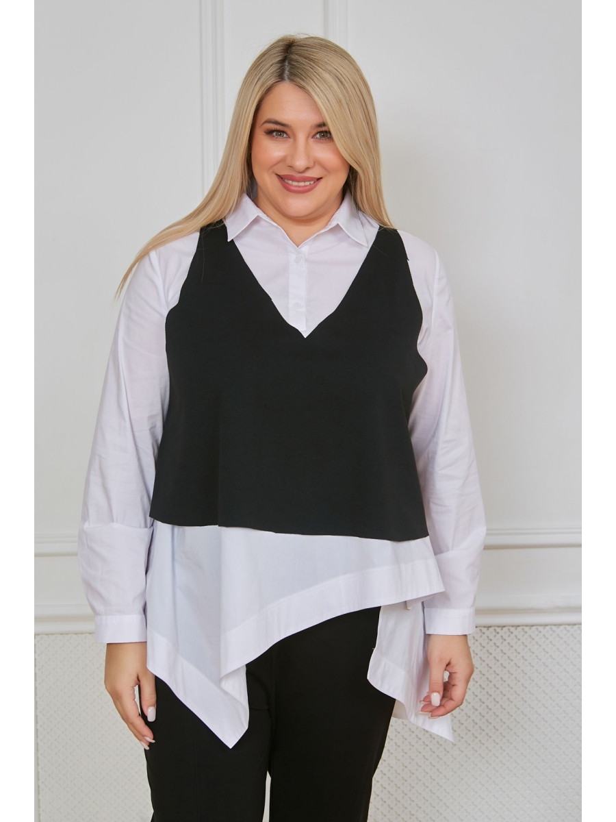 Стильная рубашка расклешенного силуэта выполнена из хлопковой ткани Модель с центральной застежкой - планкой на петли и пуговицы, до уровня груди. Горловина оформлена отложным воротником. Рукав втачной длинный по низу дополнен манжетой с застёжкой на петлю и пуговицу. Низ асимметричный, левый боковой шов оформлен шлицей. В комплекте с рубашкой – укороченный жилет расклешенного силуэта, V – образный вырез горловины. Изделие с открытыми срезами горловины, проймы и низа.