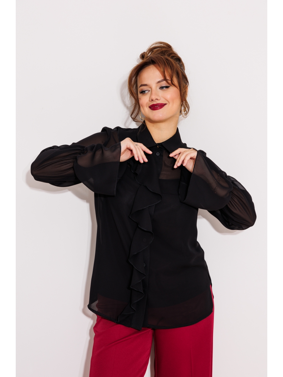 Блузка свободного силуэта выполнена из шифона. Перед с нагрудной вытачкой. Застежка центральная с отрезной планкой на петли и пуговицы. Воротник со стойкой. В правой части переда в планку вставлена рюша. Рукав втачной одношовный со сборкой на резинку в нижней части с образованием волана. В боковых швах разрезы. Пуговица на стойке декоративная. К блузке прилагается топ из того же шифона на регулируемых бретльках.Фурнитура может быть изменена с сохранением художественного образа.