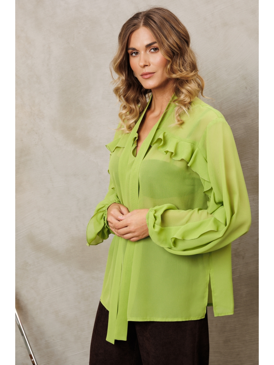 Блузка свободного силуэта из струящейся шифоновой ткани. Перед и спинка с кокеткой и сборкой. Рукав спущенный свободный с резинкой понизу. Вдоль линии кокетки и рукава вставлена рюша. Горловина V-образной формы с воротником стойкой переходящей в бант.