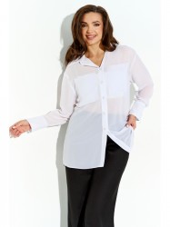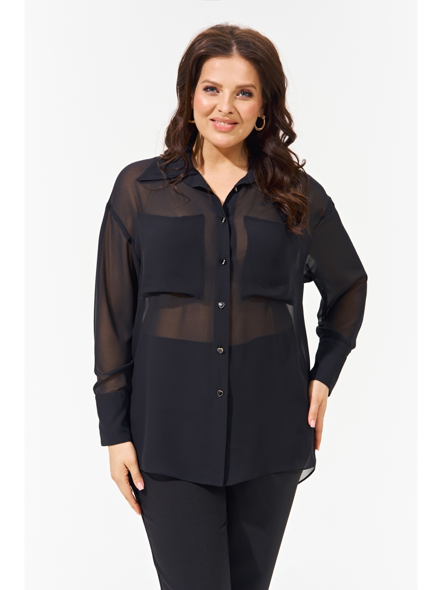 Рубашка-накидка женская свободного силуэта выполнена из легкого просвечивающегося шифона. Рукава со спущенной линией плеча на манжетах, по переду накладные карманы, застежка на петли и пуговицы.