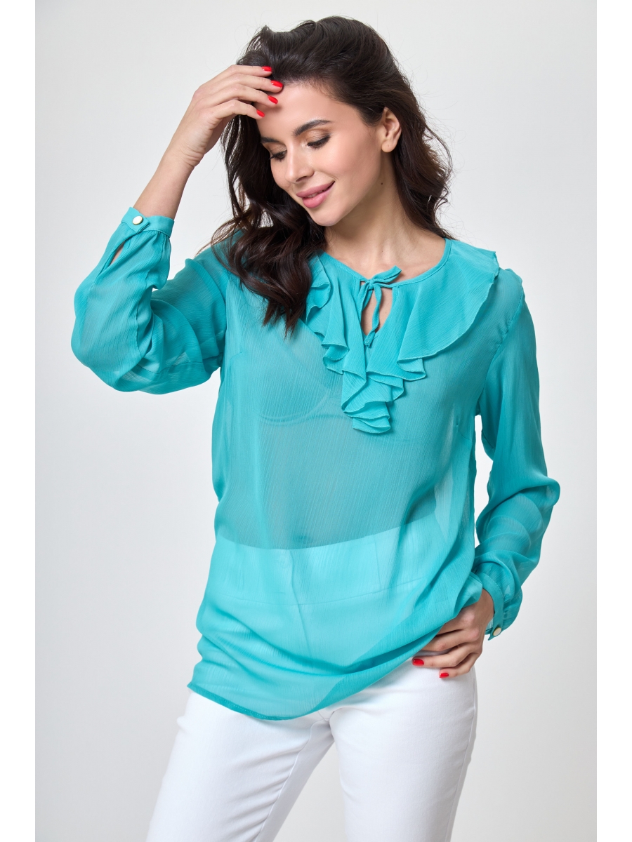 Блуза прямого силуэта, длиной до середины бедра. Рукав втачной, длинный, низ со сборкой, на узкой манжете. По переду капля и фиксируется бантом, горловина декорирована рюшей. Отличный офисный вариант и актуальная цветовая гамма на выбор.