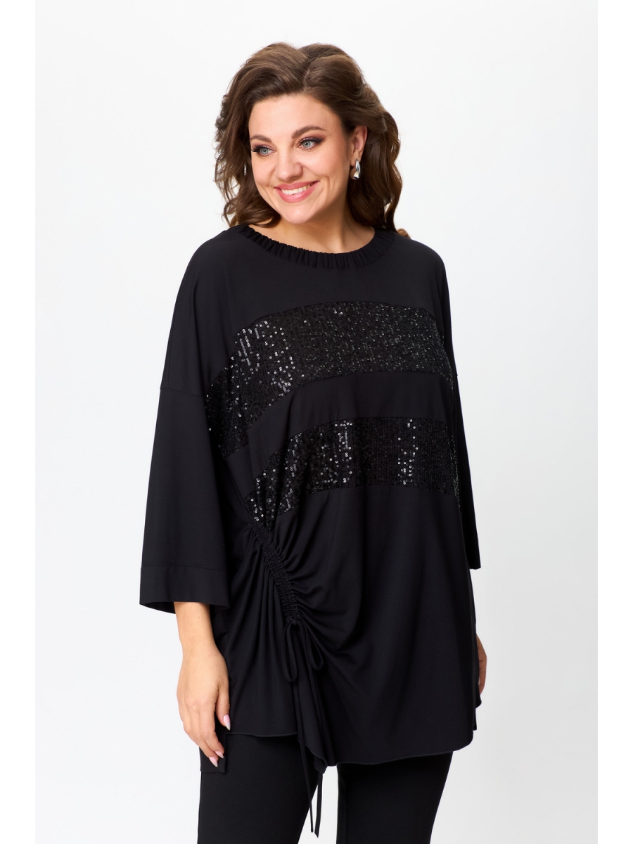 Оформить заказ →Блузка женская свободного силуэта ”oversize”, рукав 7/8 со спущенной линией плеча. Вырез горловины округлый, с присборенной планкой. Перед блузки со вставками из отделочной ткани с пайеткой. Модель с асимметричным низом, за счет подреза и легкой сборки на кулису.