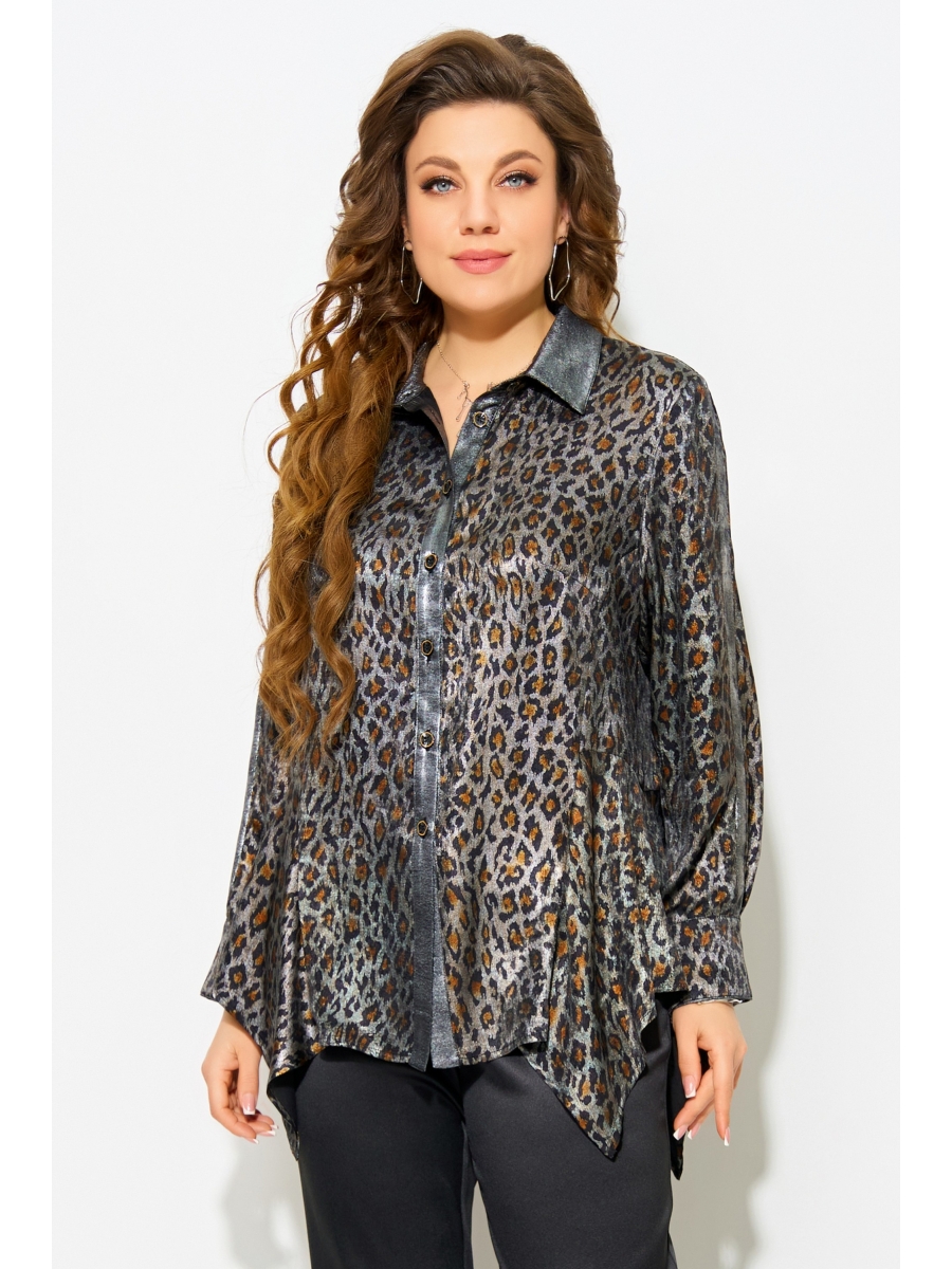 Необычно-красивая нарядная блузка ""Русалия"". Блузка без подкладки, ткань мягкая, приятная к телу, присутствует леопардовый сатиновый рисунок. Это стильная блузка полуприлегающего силуэта, эффектом блузки является отделка из сатиновой серебристой ткани. Застежка в блузке однобортная: одна планка из отделочной сатиновой серебристой ткани, вторая планка из основной леопардовой ткани, в шов вставлен кант из отделочной ткани. Воротник рубашечного типа со стойкой, по краю воротника кант. По полочке блузки рельефы, по бокам подрезы, расклешенные к низу. По спинке блузки - отрезная кокетка и рельефы. Рукав втачной с лампасом из отделочной ткани. По низу рукава - манжет с застежкой на две пуговицы. Низ изделия обработан швом в подгибку с закрытым срезом.