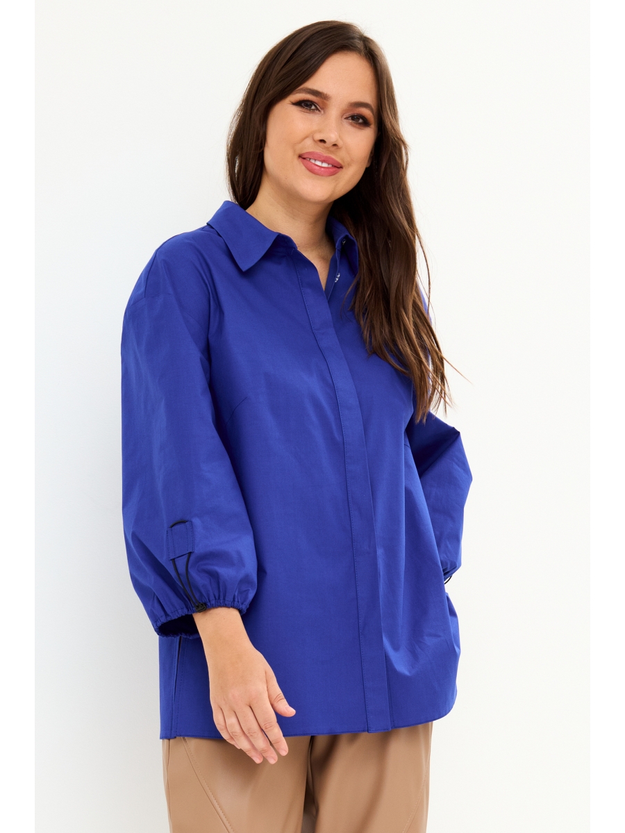Стильная блуза рубашечного кроя. Выполнена из хлопковой ткани. Застежка на пришивные пуговицы, закрытые планкой. Рукав слегка спущен, снизу со сборкой.