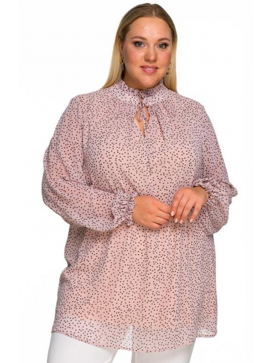 Изысканная блуза из шифона. По воротнику - стоечке настрочена рюшь. По центру переда стойка завязывается на шнурочки из основной ткани. Рукав достаточно свободный, по низу рукава настрочена резиночка, образующая рюшь.