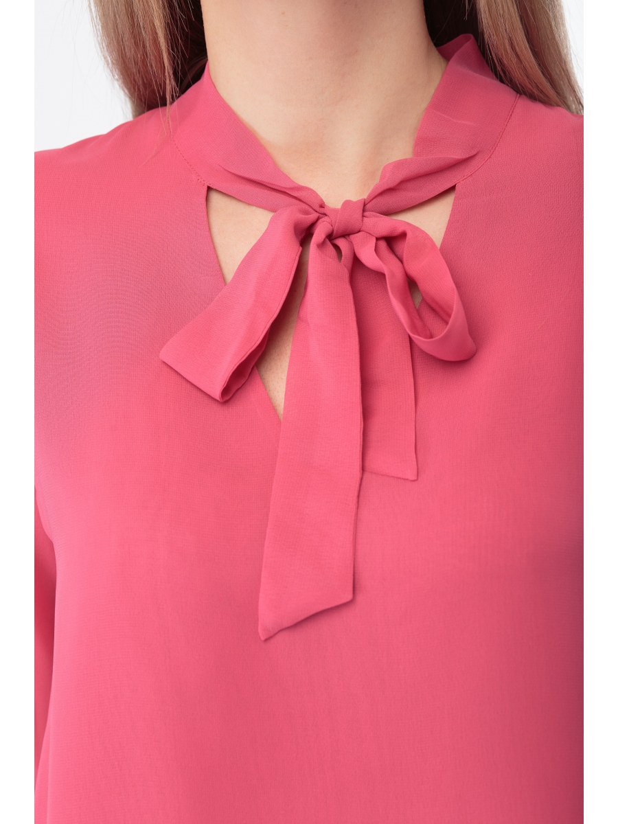Блуза имеет V-образный вырез горловины, а воротник-стойку можно завязать на шее красивым бантом либо оставить свободным по вашему желанию.