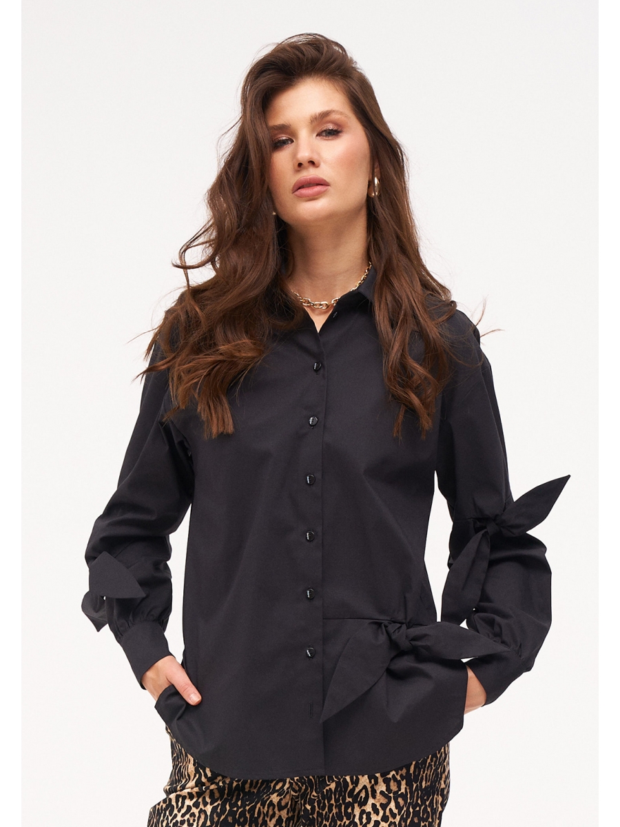 Оформить заказ →Рубашка свободного силуэта со спущенной линией плеча, классическим воротником на стойке и с застёжкой на планку с пуговицами. По переду и рукавам декоративные элементы в виде завязок. Спинка слегка длиннее переда. По бокам разрезы.