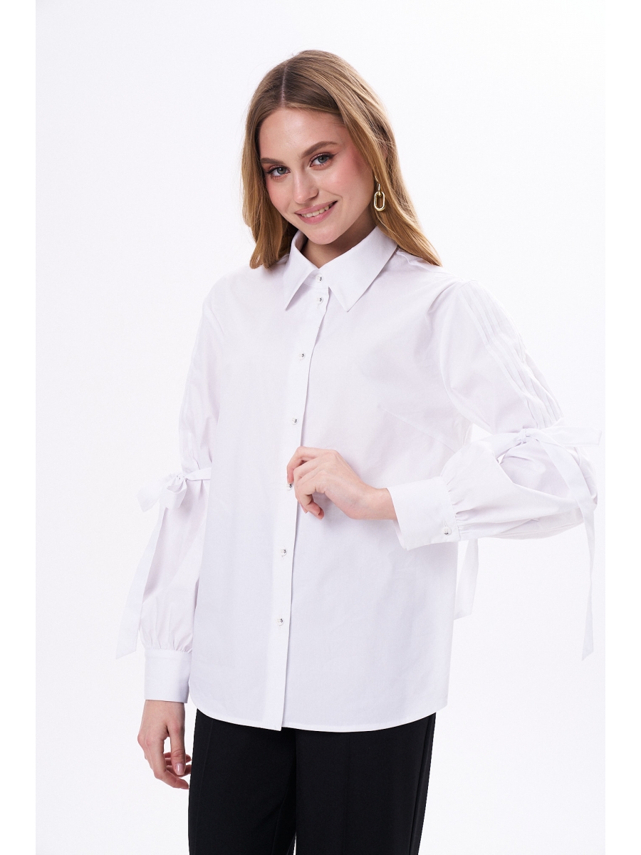 Оформить заказ →Хлопковая рубашка с акцентом на рукава. Верхняя часть рукава с защипами плавно переходит в объёмный низ со сборкой на манжете. Слегка выше локтя декоративная завязка на бант. Воротник классической формы. По переду нагрудные вытачки. Застёжка на пуговицы.