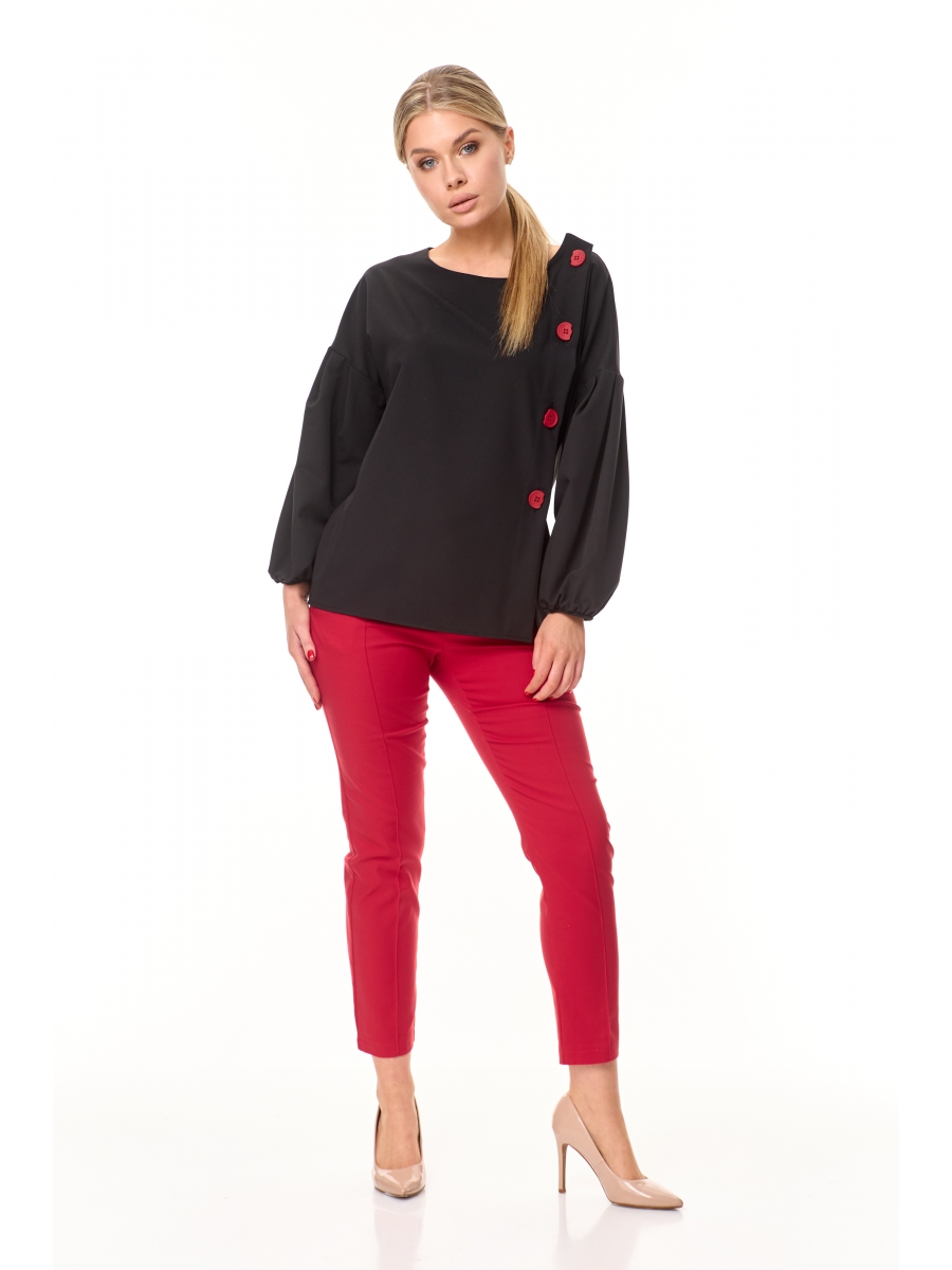 Блузка свободного силуэта. Выполнена из ткани приятной и нежной к телу. Рукав со спущенной линией плеча, низ обработан резинкой. Горловина обработанна обтачкой. По переду застежка на петли пуговицы. Спинка цельнокроеная. Актуальный в этом сезоне свободный силуэт, для любых типов фигур!