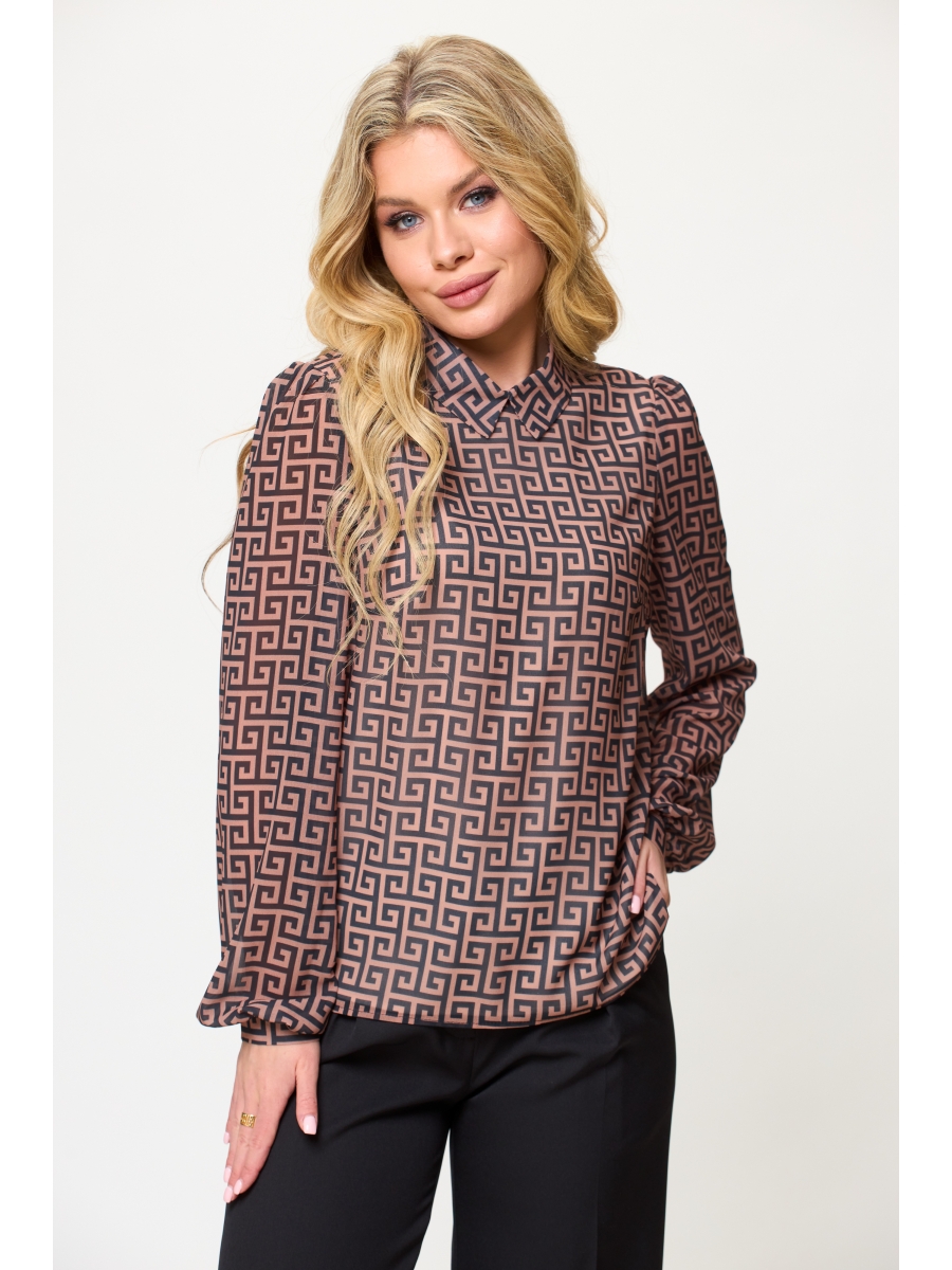 Стильная блузка офисного типа, прекрасно сочетается с брюками, юбками, жилетами. Модель полуприлегающего силуэта с воротником по горловине с застежкой каплей на одну пуговицу по спинке, по переду комбинированная ткань (основная+подклодочная в виде блузочного однотона). Спинка цельнокроеная. Рукав втачной, полной длины с притачной манжетой, застегивающейся на пуговицу. Модель актуальна круглый год.