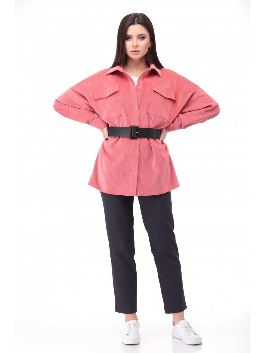 Рубашка женская, свободного кроя. Перед с нагрудными карманами и центральной застежкой на кнопки. Рубашка со спущенным плечом. Рукав длинный, втачной. Низ рукава с манжетой. Воротник втачной со стойкой.