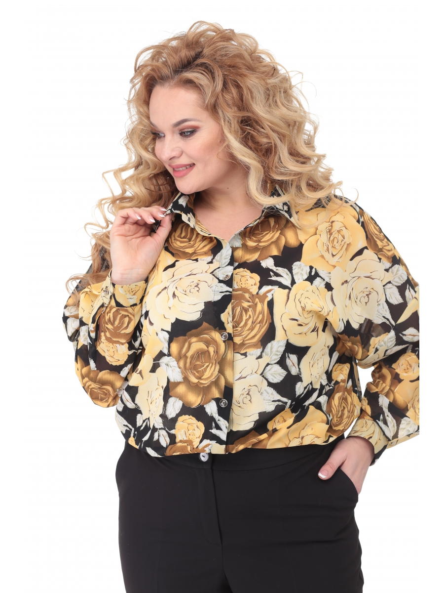 Рубашка женская, свободного кроя. Перед с центральной застежкой на петли пуговицы. Рубашка со спущенным плечом. Рукав длинный, втачной. Низ рукава с манжетой. Воротник втачной со стойкой.
