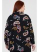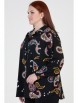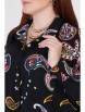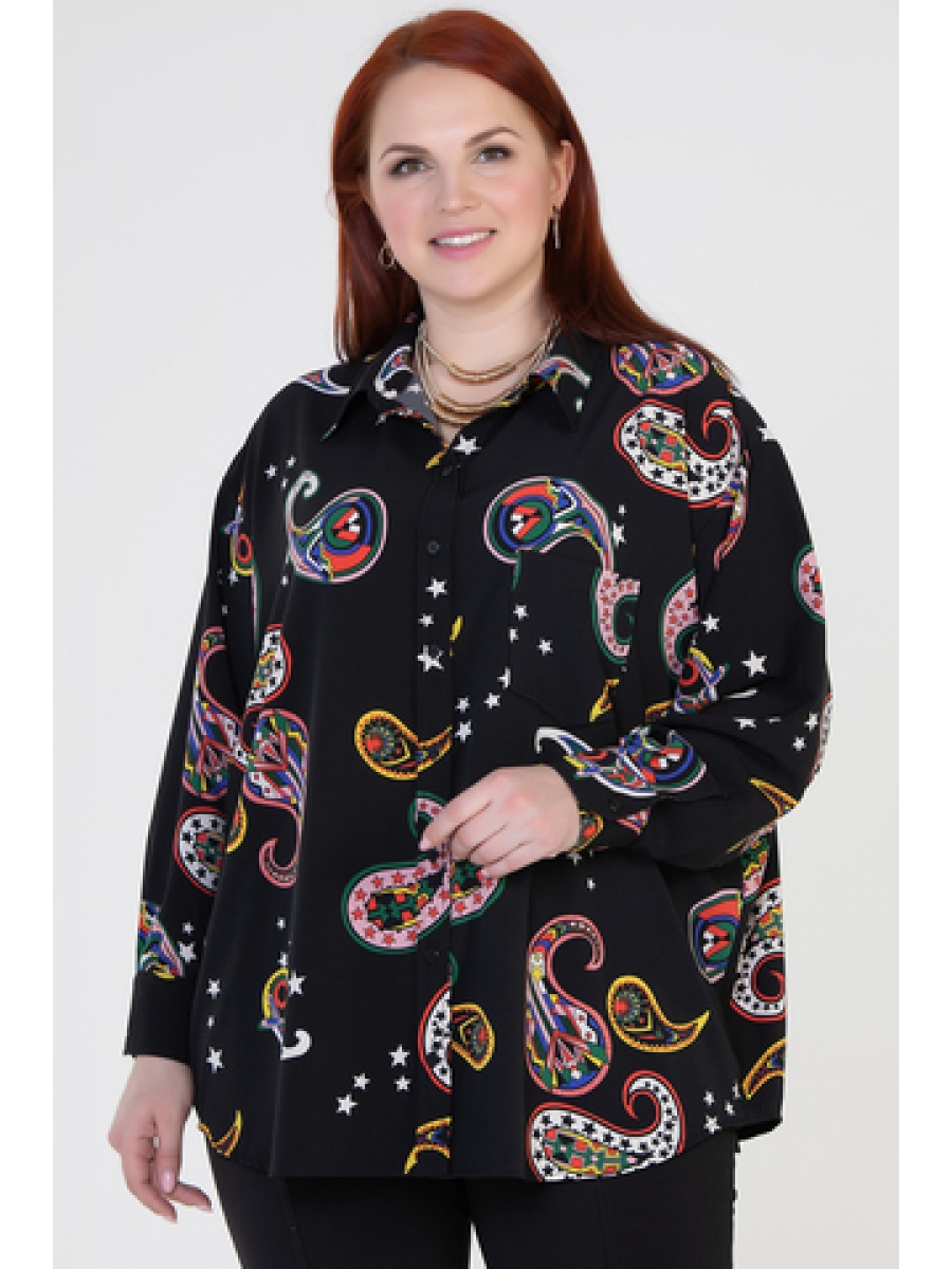 Блуза прямого силуэта, разноуровневая. Перед по центру с планкой, застегивающейся на петли и пуговицы, с накладным карманом . Плечо спущенное, рукав длинный, втачной, по низу на притачной манжете, застегивающейся на петлю и пуговицу. Спинка с кокеткой. Воротник с острыми концами на стойке, застегивающейся на петлю и пуговицу. Размеры блузы сдвоенные.