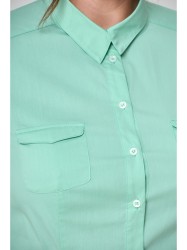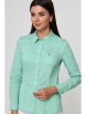 Блузка классического покроя. Полочки с нагрудными вытачками от низа, накладными карманами с закруглёнными краями. Спинка с талевыми вытачками и цельнокроеной кокеткой, переходящей на полочку. Воротник на стойке, застежка на пуговицы на цельнокроеной планке. Рукава втачные с манжетами на пуговицы, рукав регулируется патой на пуговицу.