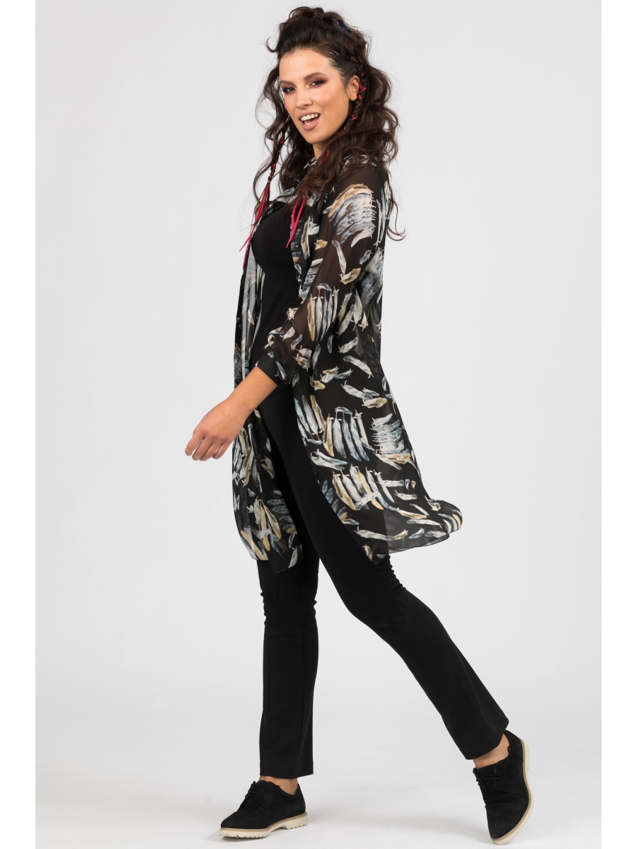 Блуза прямого силуэта с закругленным низом по переду и спинке . Перед по центру с застежкой на петли и пуговицы. Спинка с двойной кокеткой. Рукав втачной, длинный, по низу на притачной манжете, застегивающейся на петлю и пуговицу. Воротник с острыми концами на притачной стойке, застегивающейся на петлю и пуговицу.