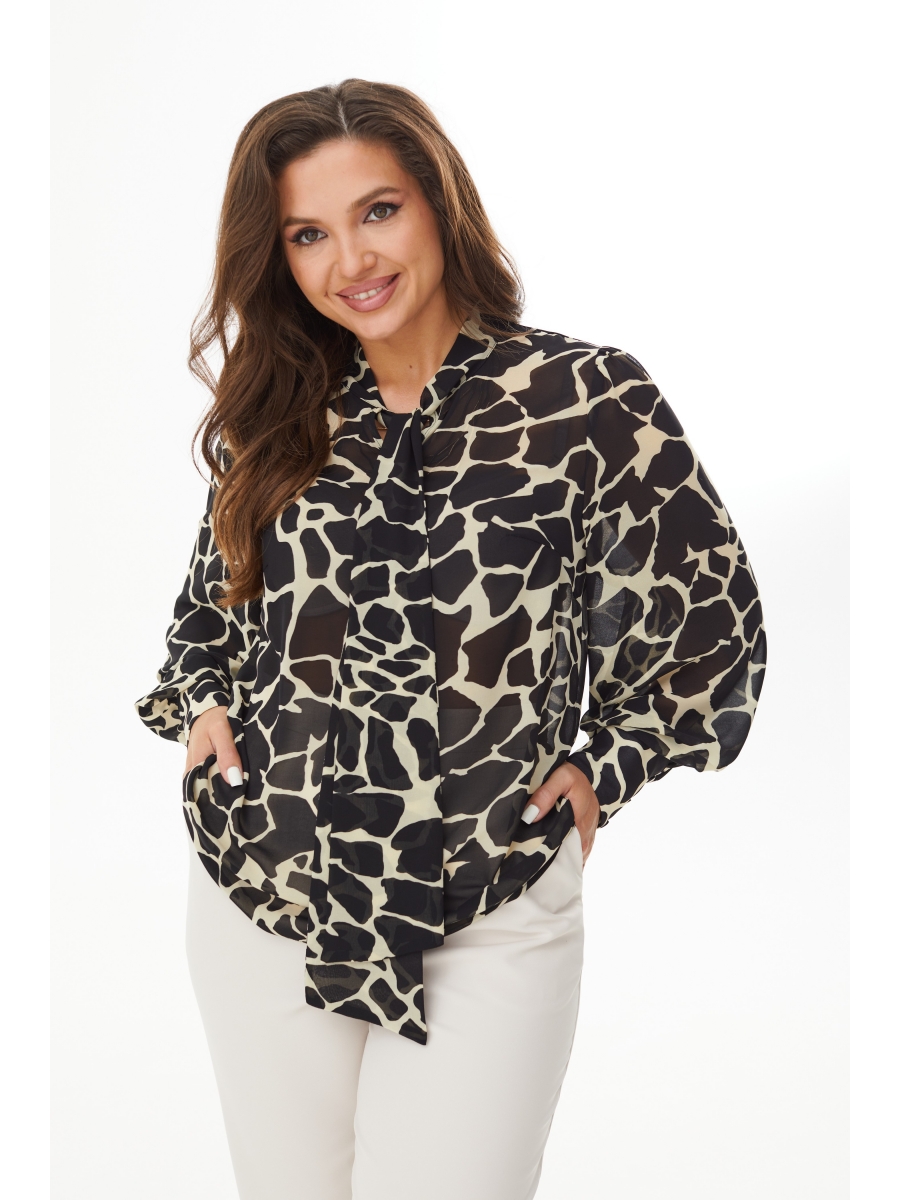 Оформить заказ →Блуза из лёгкой струящейся ткани. Горловина круглая с воротником - галстуком. Длинный втачной рукав со сборкой, на манжете.