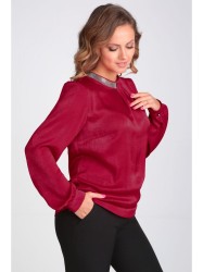 Блуза женская, прямого силуэта, с нагрудными вытачками. Воротник, втачной, стойка, украшенный стразами по левой стороне. От линии груди к стойке по левой стороне, идут складки, закрепленные по горловине. Застёжка центральная, по спинке, на "слезку". Рукав втачной, одношовный, с притачными манжетами.