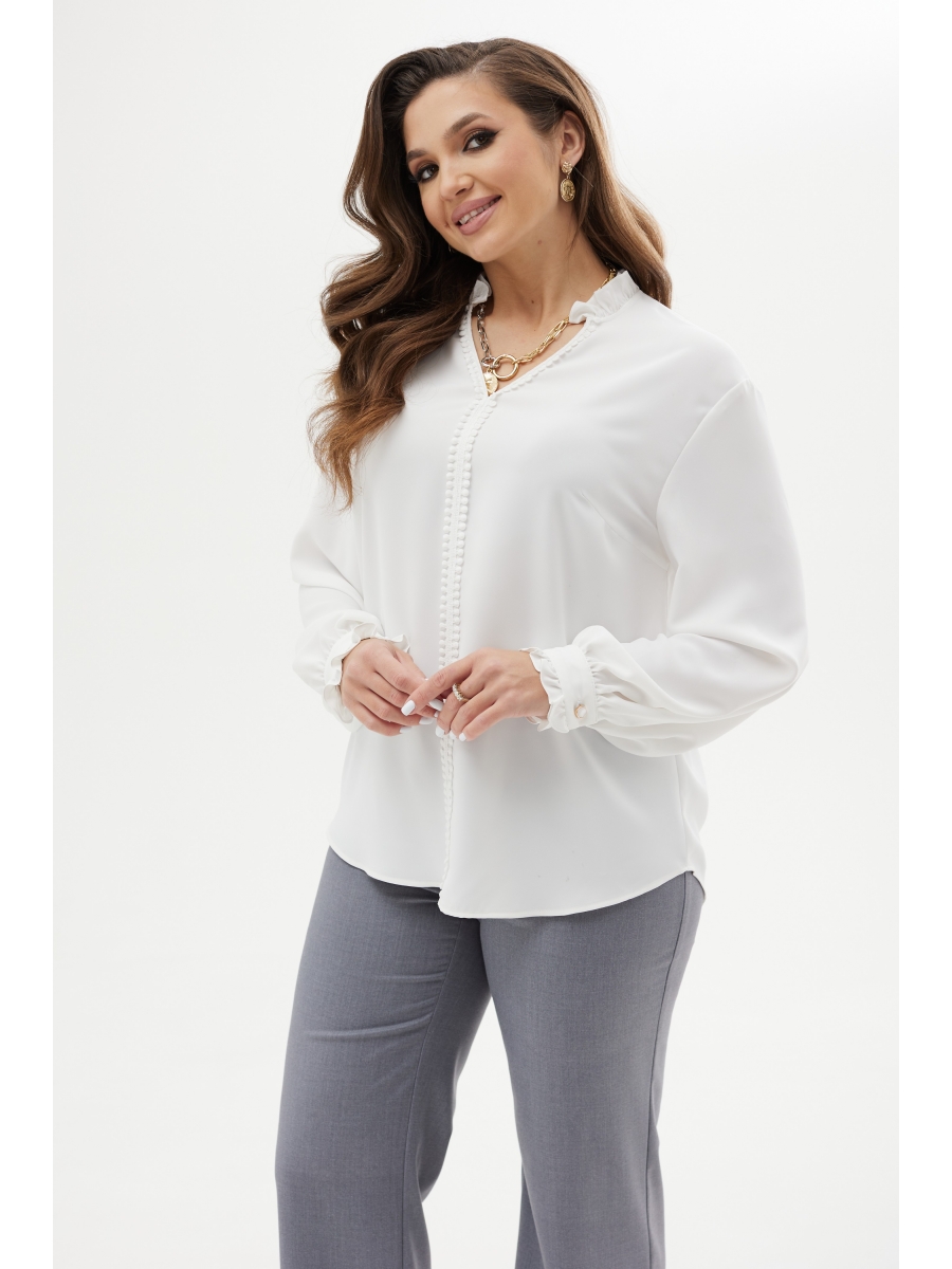 Оформить заказ →Блуза прямого силуэта с фигурным низом. Плечо спущенное, рукав расширенный книзу со сборкой на манжете. Горловина V-образной формы. По горловине и по центру переда декоративная тесьма. В горловине и по низу манжеты рюша.