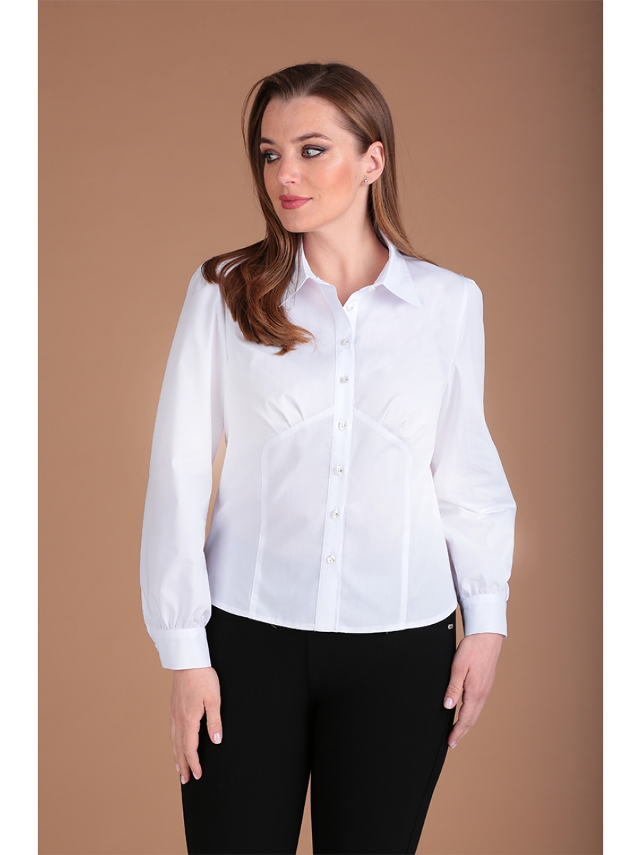 Деловая стильная блуза приталенного силуэта с центральной застежкой по полочке. Воротник втачной на стойке рубашечный. Рукав по окату присборен и отстрочен припуск по полочке и спинке. На спинке имеются талевые вытачки по две с каждой стороны. На полочках фигурные рельефы, с идущими лучевыми складками к линии груди.