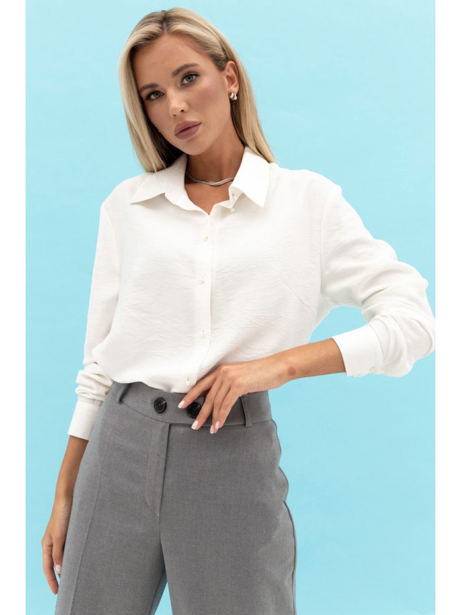 Рубашка из вискозной ткани с крэш-эффектом. Свободный силуэт с разрезами в боковых швах и застёжкой на пуговицы. Рубашечный рукав на манжете с застёжкой на пуговицы. Вырез горловины обработан отложным воротником на стойке. На задней части изделия выполнена кокетка с небольшой складкой. Достоинство этой модели - в способности скрыть некоторые недостатки фигуры. Её можно сочетать как с брюками, так и с джинсами.