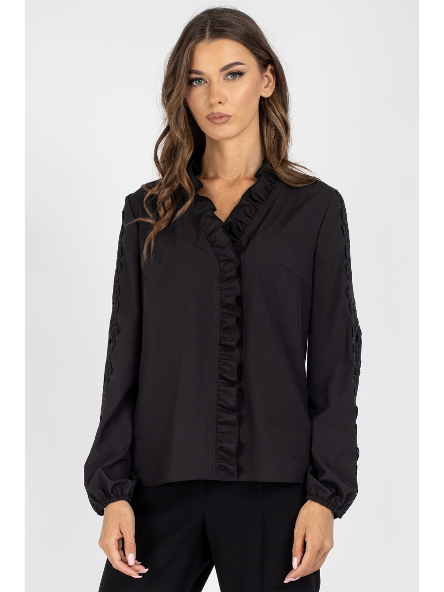 Блуза женская делового стиля прямого силуэта. Перед из двух частей с нагрудными выточками. Спинка цельная. По центру переда и горловине вставлена рюша. Рукав втачной из двух частей по центру с настроченным кружевам. Низ рукава на эластичной тесьме.