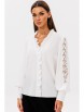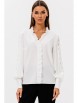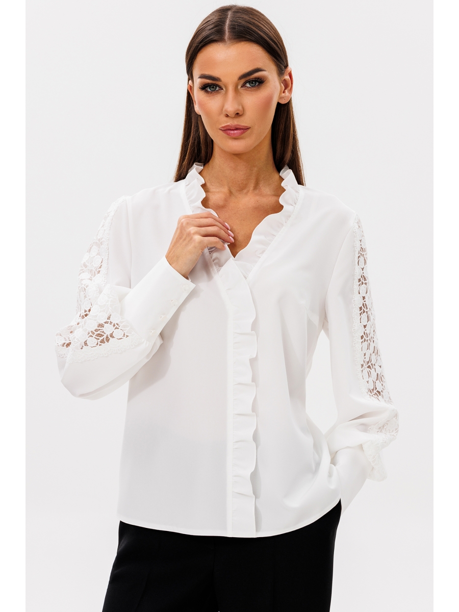Блуза женская делового стиля, прямого силуэта. Перед из двух частей с нагрудными выточками. По центру переда и горловины вставлена рюша. Спинка цельная. Рукав втачной из двух частей, по центру с настроченным кружевом, с притачной манжетой и застегивающейся на 4 пуговицы.