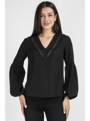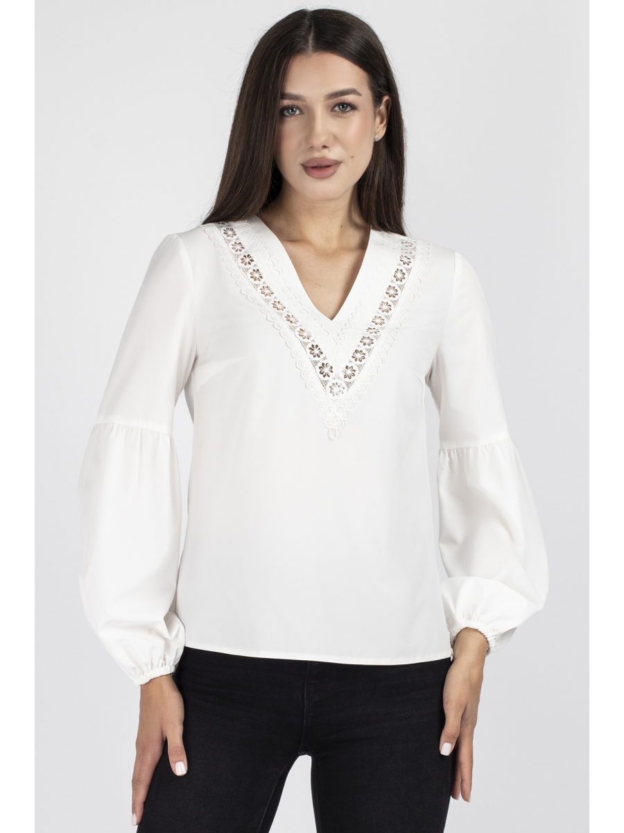Блузка женская, полуприлегающего силуэта. Перед цельный, с нагрудными выточками. Горловина V-образной формы с отделкой из кружева. Спинка цельная. Рукав втачной из двух частей, нижняя часть присборена сверху и снизу. Низ рукава на эластичной тесьме.