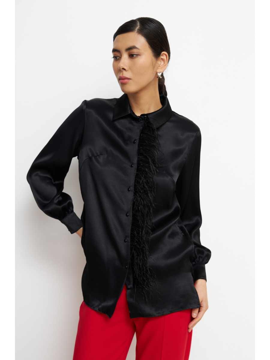 Блуза из вискозной ткани с сатиновым блеском. Свободный силуэт с разрезами в боковых швах и застёжкой на пуговицы. На задней части изделия выполнена кокетка с небольшой складкой. Вырез горловины обработан отложным воротником на стойке. Втачной рукав на манжете с застёжкой на пуговицы. Изделие украшено съемной планкой с перьями. Перед стиркой планку с перьями необходимо снять.