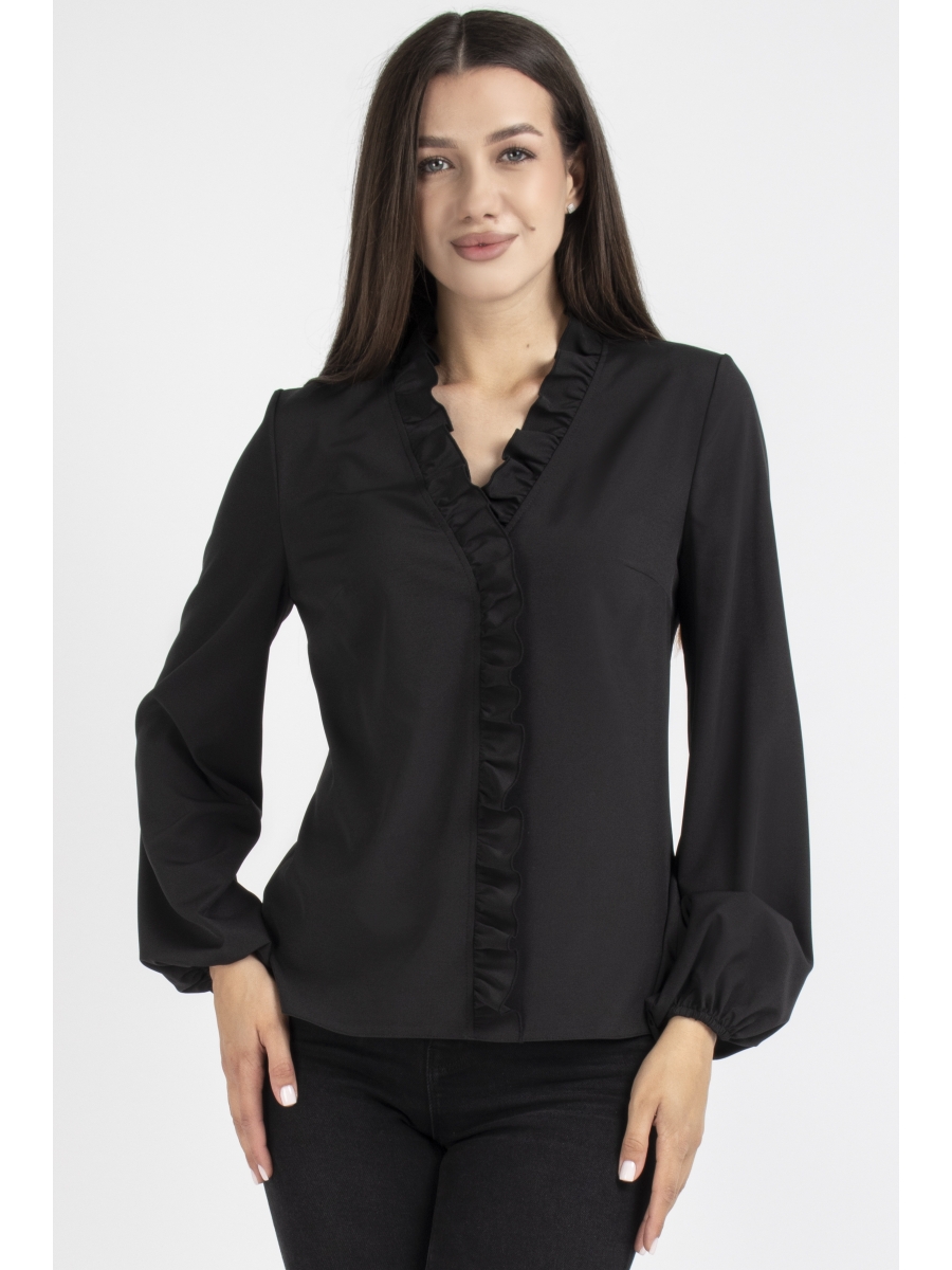 Блуза женская прямого силуэта. Перед из двух частей с нагрудными выточками. Спинка цельная. По центру переда и горловине вставлена рюша. Рукав втачной по низу на эластичной тесьме.