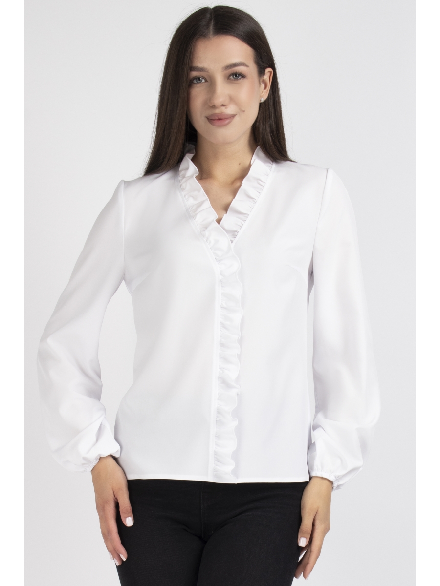 Блуза женская прямого силуэта. Перед из двух частей с нагрудными выточками. Спинка цельная. По центру переда и горловине вставлена рюша. Рукав втачной по низу на эластичной тесьме.