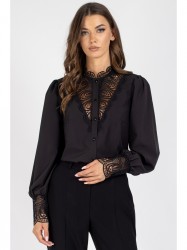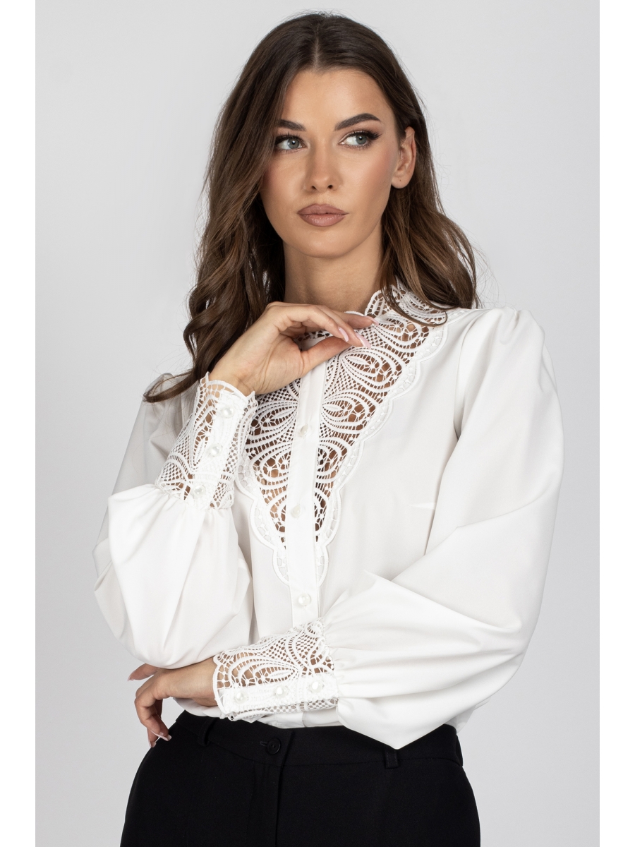 Блузка женская, полуприлегающего силуэта. Перед с нагрудными вытачками и центральной бортовой застежкой, выполненной из кружева. Спинка цельная. Горловина блузы с притачной стойкой из кружева. Рукав втачной со сборкой по окату и низу. Низ рукава с притачной манжетой из кружева, застегивающийся на 4 петли и пуговицы.