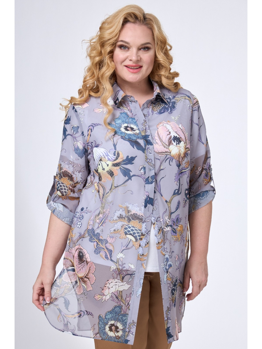 Блузка удлиненная прямого силуэта из шифоновой ткани. Воротник рубашечного типа на притачной стойке. Перед с центральной застежкой на петли и пуговицы на притачных планках. В боковых швах - разрезы. Рукав втачной длинный, с патой и на манжете с застежкой на пуговицу.