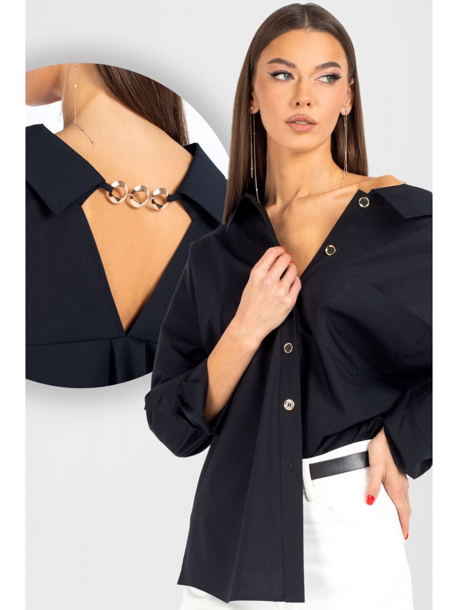Блузка-рубашка прямого силуэта со спущенным плечом. Перед с центральной бортовой застежкой на 6 петель п пуговиц. На левой части переда настрочен карман. Спинка с кокеткой, бантовой складкой. Кокетка с V-образным вырезом и цепочкой. Рубашка с отложным воротником. Рукав с манжетой на 1 петлю и пуговицу.