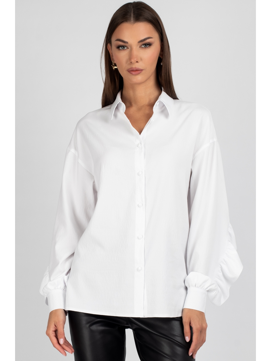 Женская блузка свободного прямого кроя OVERSIZE-силуэта со спущенной линией плеча — идеальный выбор для создания актуального и непринужденного образа. Передняя часть выполнена из двух симметричных деталей и дополнена центральной застёжкой на 7 пуговиц и петель, что обеспечивает удобство и визуальную симметрию. Спинка украшена кокеткой с декоративной рюшей, плавно переходящей на рукава — изысканный акцент, добавляющий женственности. Рукава завершены манжетами на 2 пуговицы, что позволяет регулировать посадку и подчеркивает аккуратность силуэта. Воротник классического рубашечного типа с отрезной стойкой — универсальный элемент, подходящий как для офисного стиля, так и для повседневных образов.