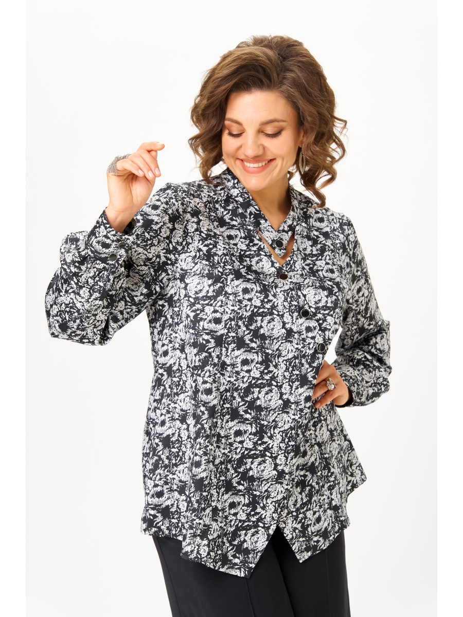 Эта блуза — про характер. Про ту самую дизайнерскую работу, где каждая деталь продумана: асимметричная застёжка, аккуратные чёрные пуговицы, перекрытие полочек, создающее мягкую архитектуру силуэта. Принт — графический флоральный орнамент, ближе к бионике: будто цветы, живущие в ритме линий и штрихов. Благодаря этому рисунку вещь выглядит не просто «нарядной», а современной, динамичной, стильной. Ткань — качественный полиэстер с лёгким сатиновым блеском. Он струится, держит форму и «собирает» образ без усилий. Блуза универсальна: спорт, офис, классика, гастродейтинг, дом, путешествия — она работает в любой капсуле.