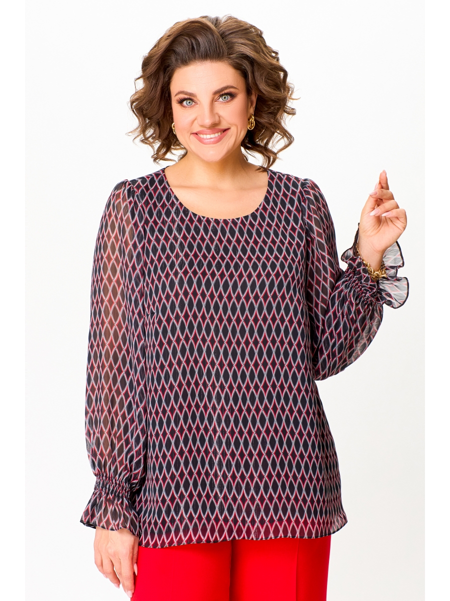 Оформить заказ →Блузка А-силуэта из нежной шифоновой ткани на подкладке из шифона. Полочка с нагрудными выточками, спинка без особенностей. Горловина круглая. Рукав втачной длинный по окату со сборкой, в нижней части собран на эластичную нить, которая внизу образует рюшу высотой 6 см.