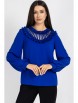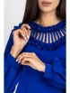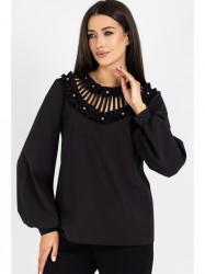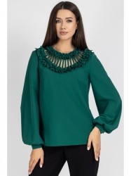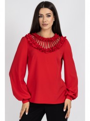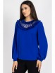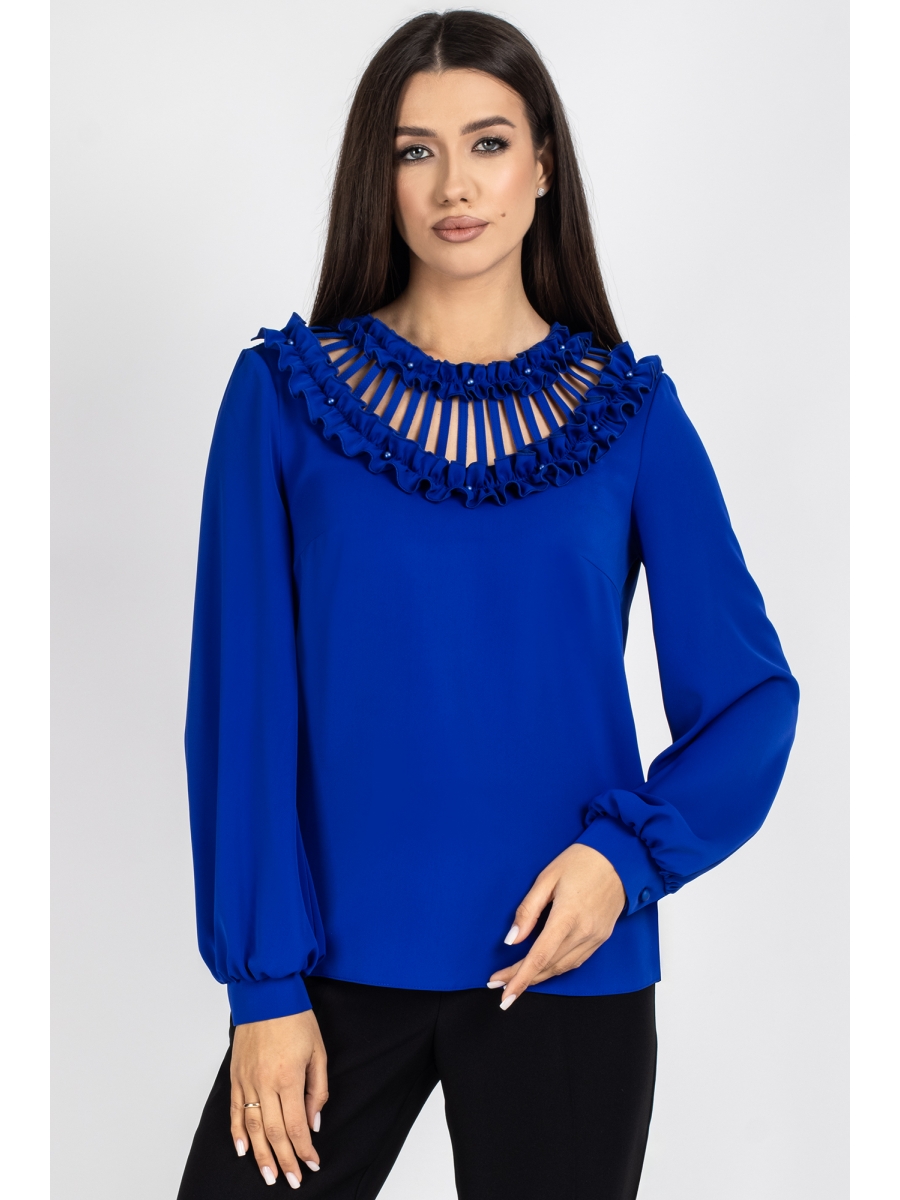 Блузка женская полуприлегающего силуэта. Перед с нагрудными вытачками. Отделочным элементом переда является V-образный вырез с планочками и настроченными рюшами. На рюшах жемчуг. Спинка с капелькой и застежкой на навесную петлю и пуговицу. Рукав втачной, внизу со сборкой и притачной манжетой. Манжета застегивается на петлю и пуговицу.