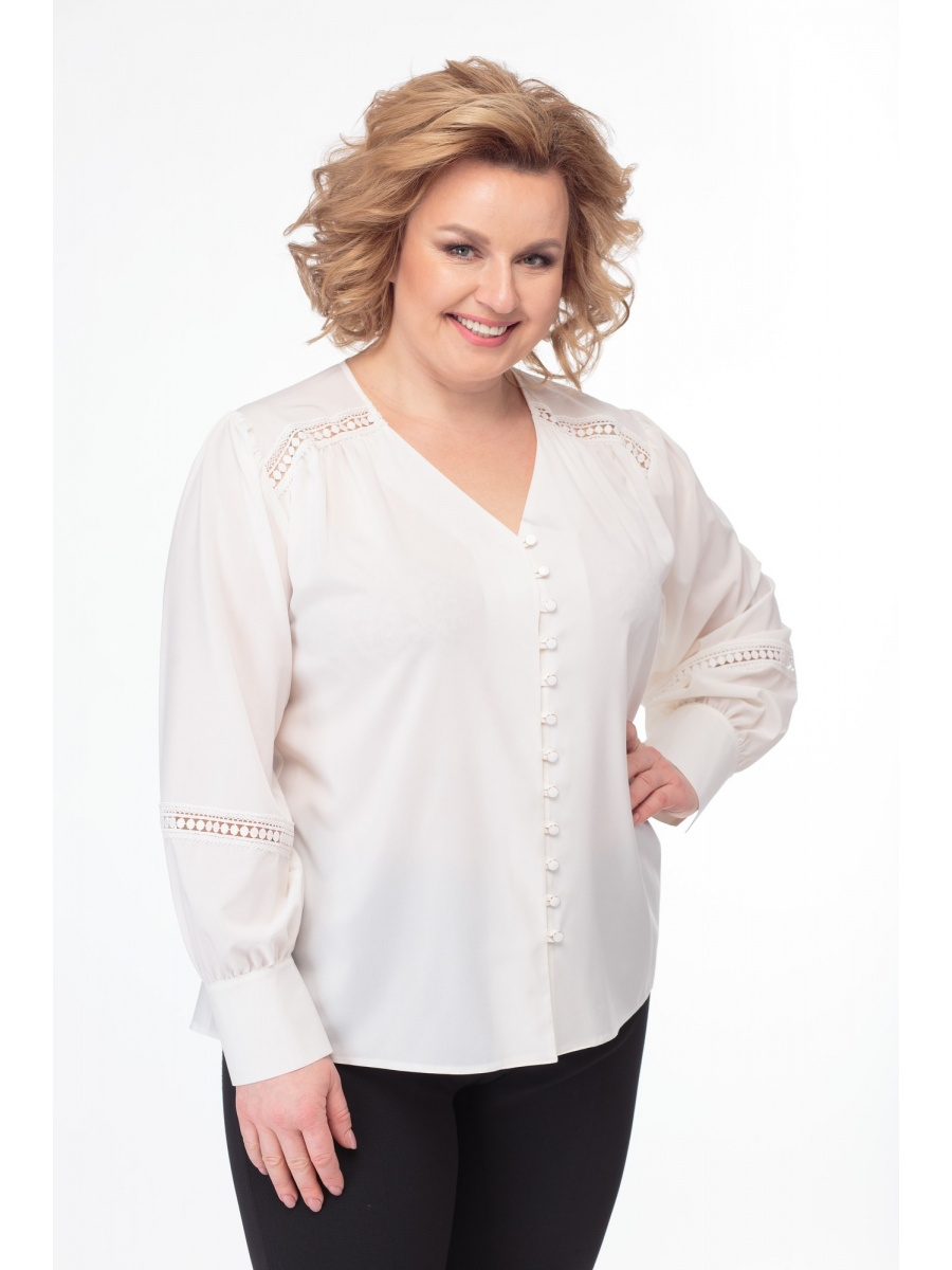 Перед и спинка с романтичными кокетками и кружевными вставками, v-образный вырез горловины, застежка на навесные петельки и пуговицы. Втачной рукав на манжете и кружевной вставкой. Идеально сочетается с юбкой и брюками. Отличный выбор для будней и выходных!